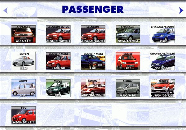 Spare parts catalogue Daihatsu Microcat EPC Models List:Daihatsu Cars:Daihatsu Applause A101/a111Daihatsu Charade G100/101/102/112Daihatsu Charade G100/101/102/112Daihatsu Charade F200/1/2/3/4Daihatsu Charade/Cuore L251Daihatsu Copen L880Daihatsu Cuore/Mira L200/201Daihatsu Cuore/Mira L501Daihatsu Cuore/Mira L701Daihatsu Fran Move/Pyzar G301/G303Daihatsu Move L601Daihatsu Move L901Daihatsu Sirion M100/110/101/111Daihatsu Terios J100/102/122Daihatsu YRV M200/201/211 Daihatsu Light Commercial:Daihatsu Delta 1984-1999Daihatsu Delta 1999-Daihatsu Feroza F300/F310Daihatsu Rocky F70/75/77/80/85/87Daihatsu Rocky F73/F78/F93/F98