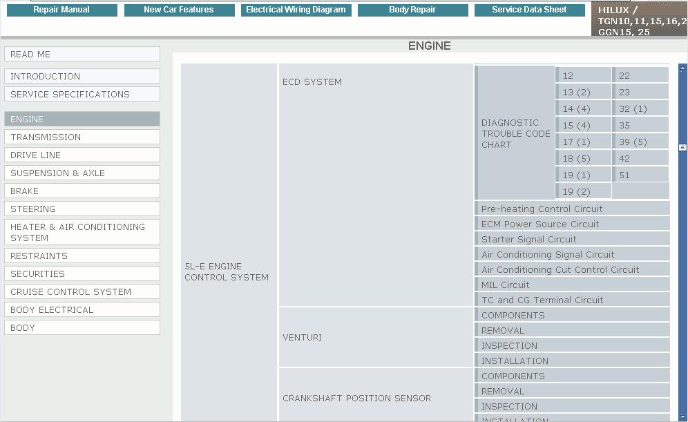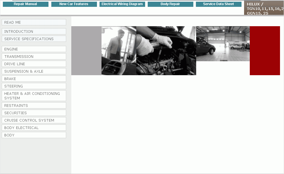 The program Toyota Hilux GGN15, GGN25, GGN35, KUN10, KUN15, KUN16, KUN25, KUN26, KUN35, KUN36, LAN15, LAN25, LAN35, TGN10, TGN11, TGN15, TGN16, TGN26, TGN36 series, RHD & LHD contains a detailed and full description of repair and diagnostics of all units of the automobile, including detailed electric schemes, the moments of inhalings, the process of assembly and disassembly of the engine and other units and units, body sizes for an extract of a body, detailed repair transmission automatic and manual, repair of coupling, steering management, the conditioner, all-electric components and blocks of the management, the necessary special tool, and as other information.